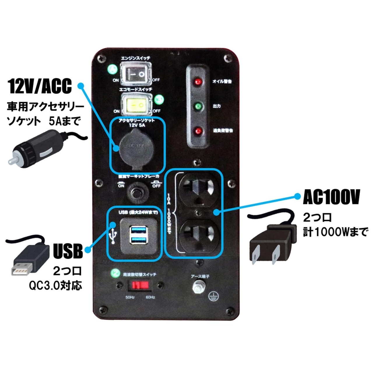 周波数:50Hz/60Hz(切替式)、交流:定格出力1.0kVA・定格電圧100V・定格電流10A、アクセサリーソケット:定格電圧12V・定格電流5A、USB(QC3.0対応):定格電圧・電流5V-3.4A/9V-2.5A/12V-2A(最大24W)