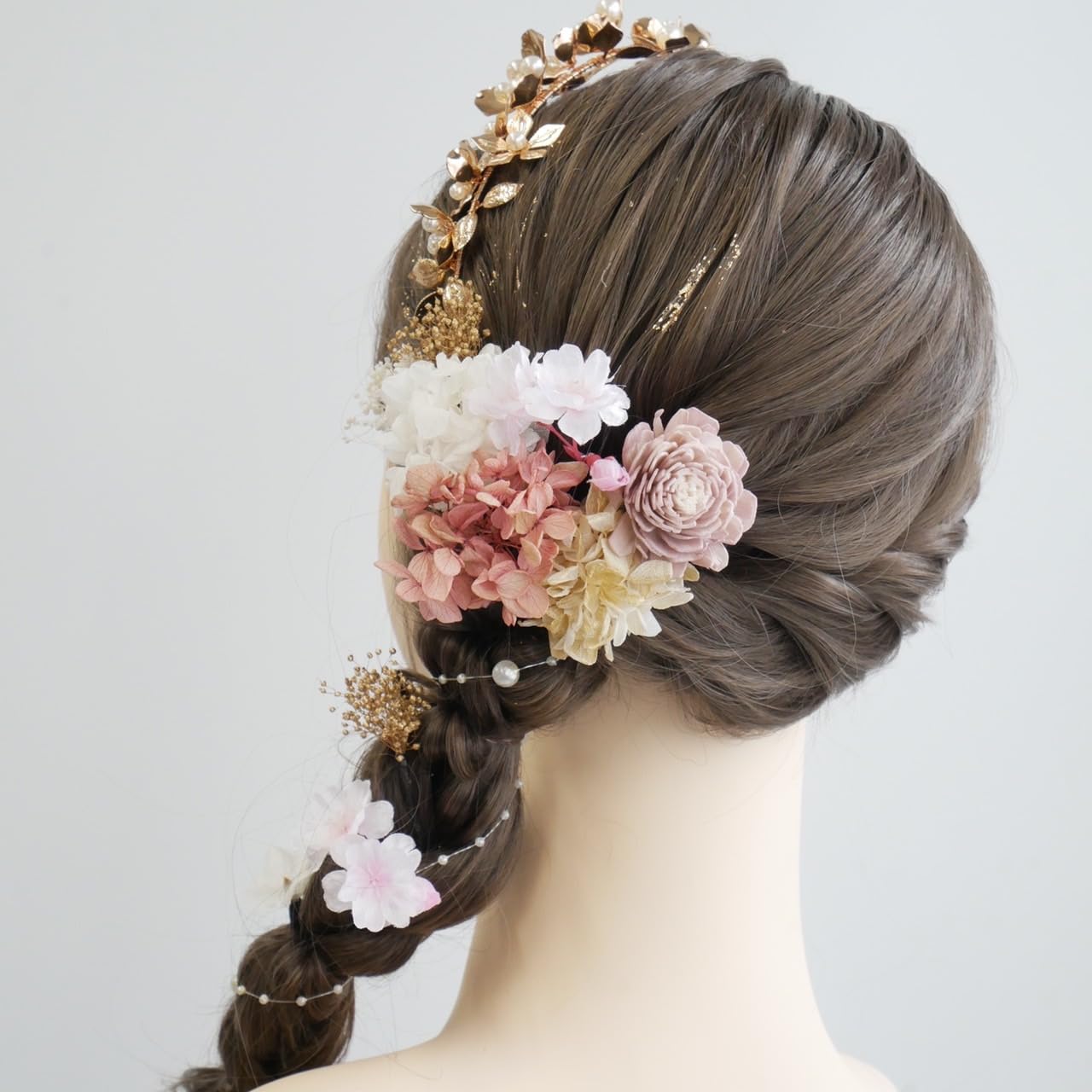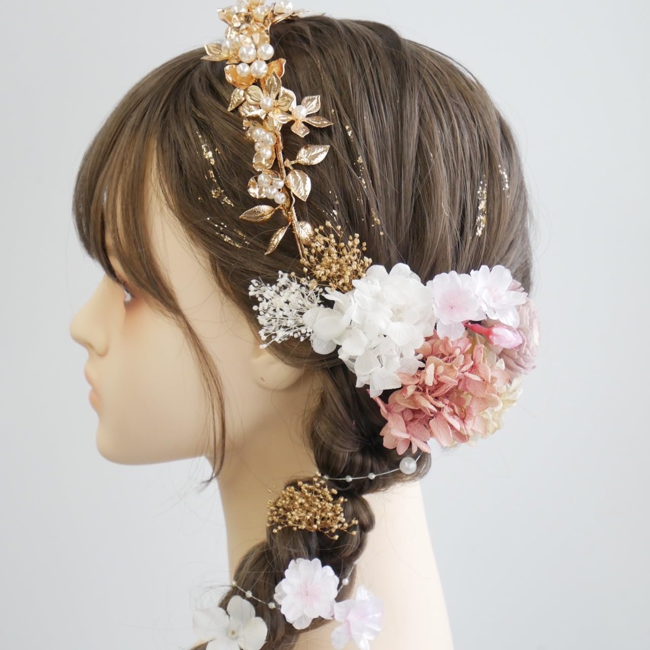 [Lomeri] ロメリ ゴールド カチューシャ ドライフラワーの髪飾り 成人式 卒業式 結婚式 袴 E32 (ピンク)