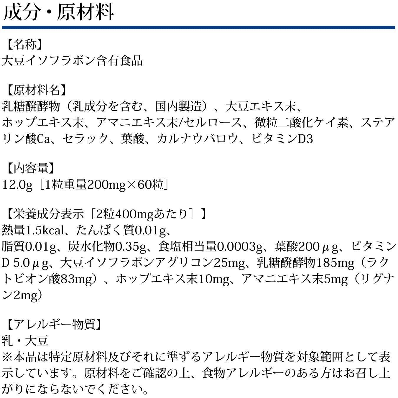 【名称】大豆イソフラボン含有食品 【原材料名】ラクトビオン酸含有乳糖醗酵物(乳成分を含む)、大豆抽出物、ホップエキス、アマニ抽出物/セルロース、微粒二酸化ケイ素、ステアリン酸Ca、シクロデキストリン、セラック、葉酸、カルナウバロウ、ビタミンD3 【内容量】12.0g[1粒重量200mg×60粒] 【栄養成分表示】[2粒400mgあたり]熱量1.5kcal、たんぱく質0.01g、脂質0.01g、炭水化物0.35g、食塩相当量0.0003g、ビタミンD 5.0μg、葉酸200μg、大豆イソフラボンアグリコン25mg、乳糖醗酵物185mg(ラクトビオン酸83mg)、ホップエキス10mg、アマニ抽出物5mg(リグナン40%)