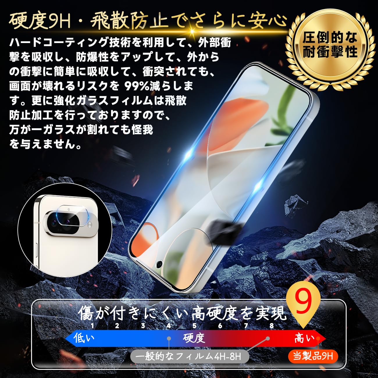 【専用設計·簡単に貼り付け】 本製品 Google Pixel 9 5G 専用液晶画面保護ガラスフィルムです。本商品は厳選した素材を採用して作られており、フィルムのシリコン自己吸着層があるので、スチールフィルムを携帯電話に合わせて軽く置くだけで、気泡が入らないように簡単に取り付けられます。(ポイント:フロントカメラのカメラ穴についてですが、ほこり・異物などの堆積を防止するため、ガラスフィルムにカメラ穴を開けていません。Seninhiのガラスフィルム 、透過率は99.9%なので、フロントカメラの正常使用に全く影響がありません。)*機種によってサイズが異なりますので、ご購入の場合に機種をよく確認してください。