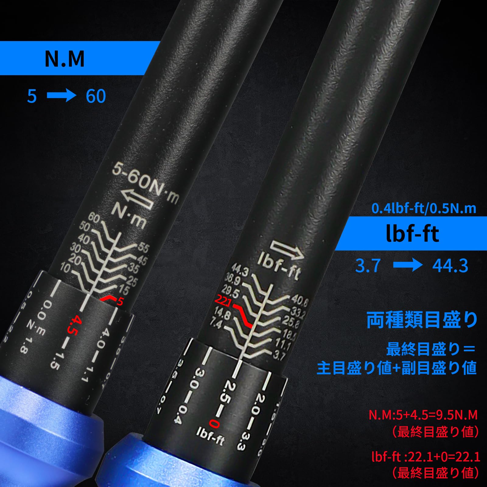 【ダブル目盛り、読みやすいトルクレンチ】2種類単位N.m / lbf-ft表示で選択肢を提供します,視認性も高いので、トルク値を簡単に読みます,炎天下でも見やすいトルクレンチです。目盛り数値はレーザー刻印で、長時間に使用しても、消えることがありません。最小目盛りは0.5N.mで、微調整できます。読み方の例:最終目盛り値(9.5N.m)=主目盛り値(5N.m)+副目盛り値(4.5N.m),ちなみに、使わない時は目盛りをゼロに回してください,本商品は毎年または5000回使用した後に検証しなければなりません