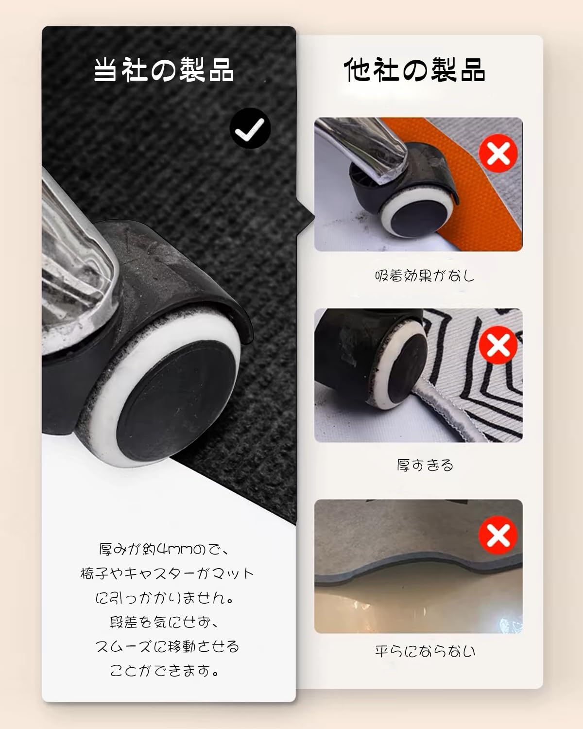 【裏面吸着加工で足元が安心】目には見えない無数の気孔が開いていて、吸着面に力が加えると空気が抜けて、真空状態になって無数の吸盤ができたようにくっつく仕組みです。ぐちゃぐちゃマットを解消して、椅子を動かすたびにキャスターがマットに引っかかってイライラ...そんなストレスから解放されて、テレワークにも集中できます。※無垢材を使用した床、老朽化した床、畳やカーペット・絨毯の上では使用できません。