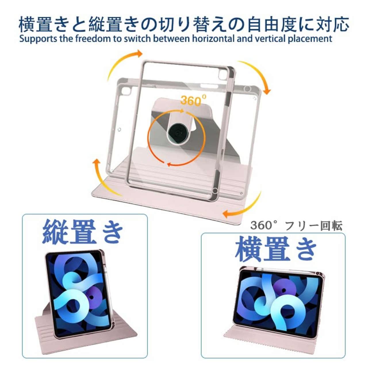 【多角度回転】本iPad ケースは横置きにも縦置きにも、360度回転設計で向きを変えることで便利なスタンドになります、お仕事やタイビングなども便利です。 ビジネス、アウトドア、学校、家事など様々なシーンで大活躍。