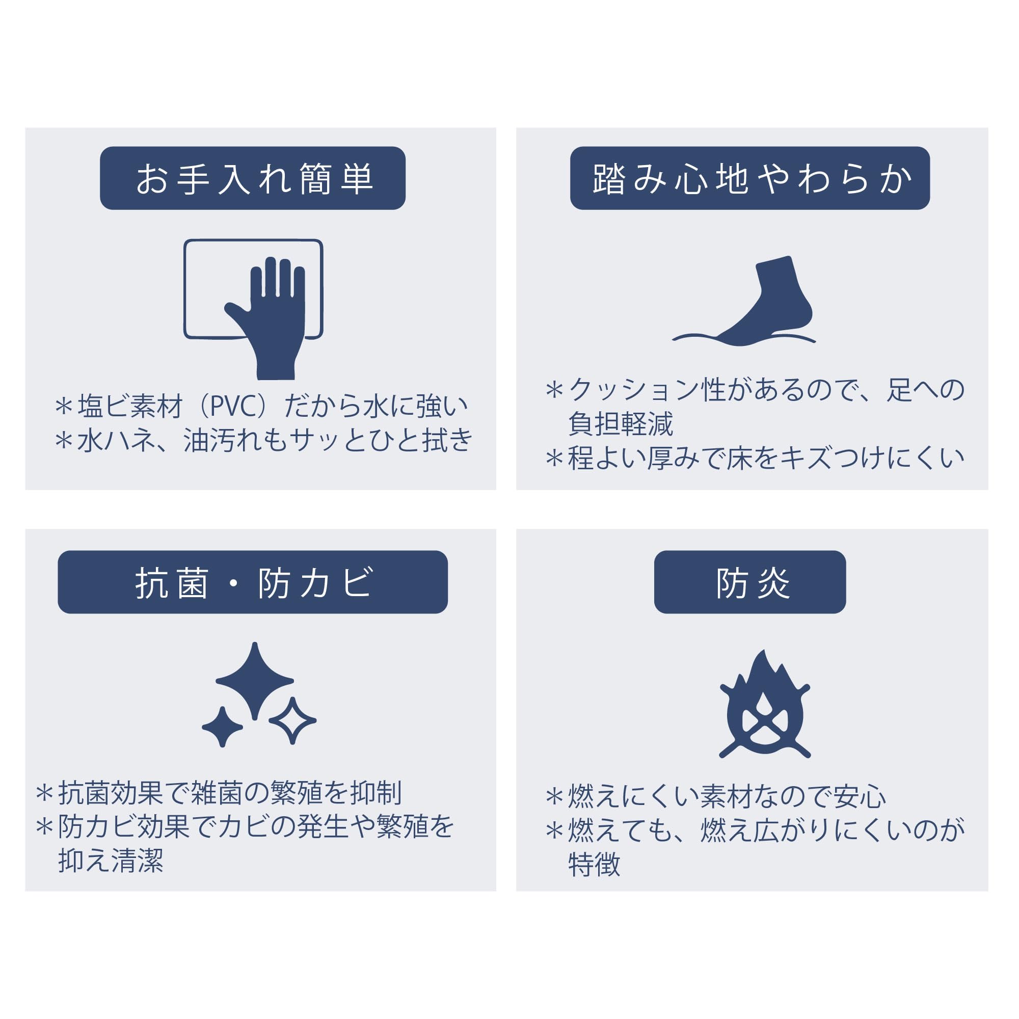 スヌーピーがデザインされた、洗濯いらずで拭くだけのお手入れ簡単ロングマット。複数のデザインとサイズから選んでいただけます。抗菌・防臭・防カビ・防炎機能。床暖房対応。厚み約6mm。裏面:すべりにくい加工。