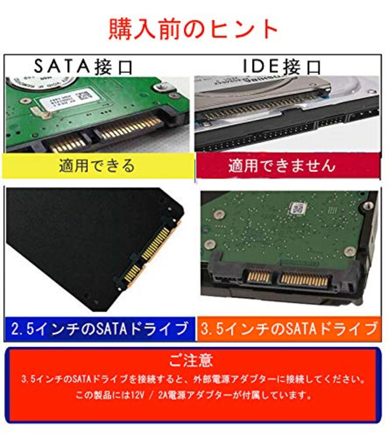 【ご注意】:3.5インチのSATAドライブを接続すると、外部電源アダプターに接続してください。この製品には12V / 2A電源アダプターが付属しています。このUSB-SATA変換アダプターと併用すれば、電力不足の心配がありません。