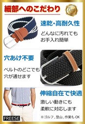 【 伸縮するベルト・快適なフィット感が実現 】 伸縮性があり伸び縮みする特製スパンデックス素材(伸縮性の高いポリエステル)の生地を採用。 歩行や運動による体のあらゆる動きに対応し、いつでも快適なフィット感をキープできます。 サイズ調整が約5ミリ単位で調整できるため、最も心地良いフィット感をキープできます。 革製ベルトによくある『締め付け感・痛み・不快感』等もありません。 ゴルフやウォーキングなどの動きの激しいスポーツシーンにも最適です。