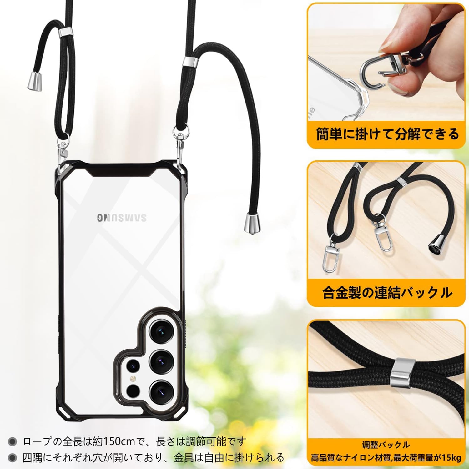 Galaxy S24 Ultra ケース クリア PC ショルダー 軽量 耐衝撃 カバー ギャラクシーS24Ultra SC-52E | SCG26 ケース 透明 薄型 軽量 PC背面 + TPUバンパー 二層構造 携帯ケース 首掛け 肩掛け 斜めかけ 縄掛けケース ストラップ付き 1.5M 取り外し可能 縦/横 2WAY 調節可能な 全面保護 落下防止 衝撃吸収 ワイヤレス充電対応 (ブラック)