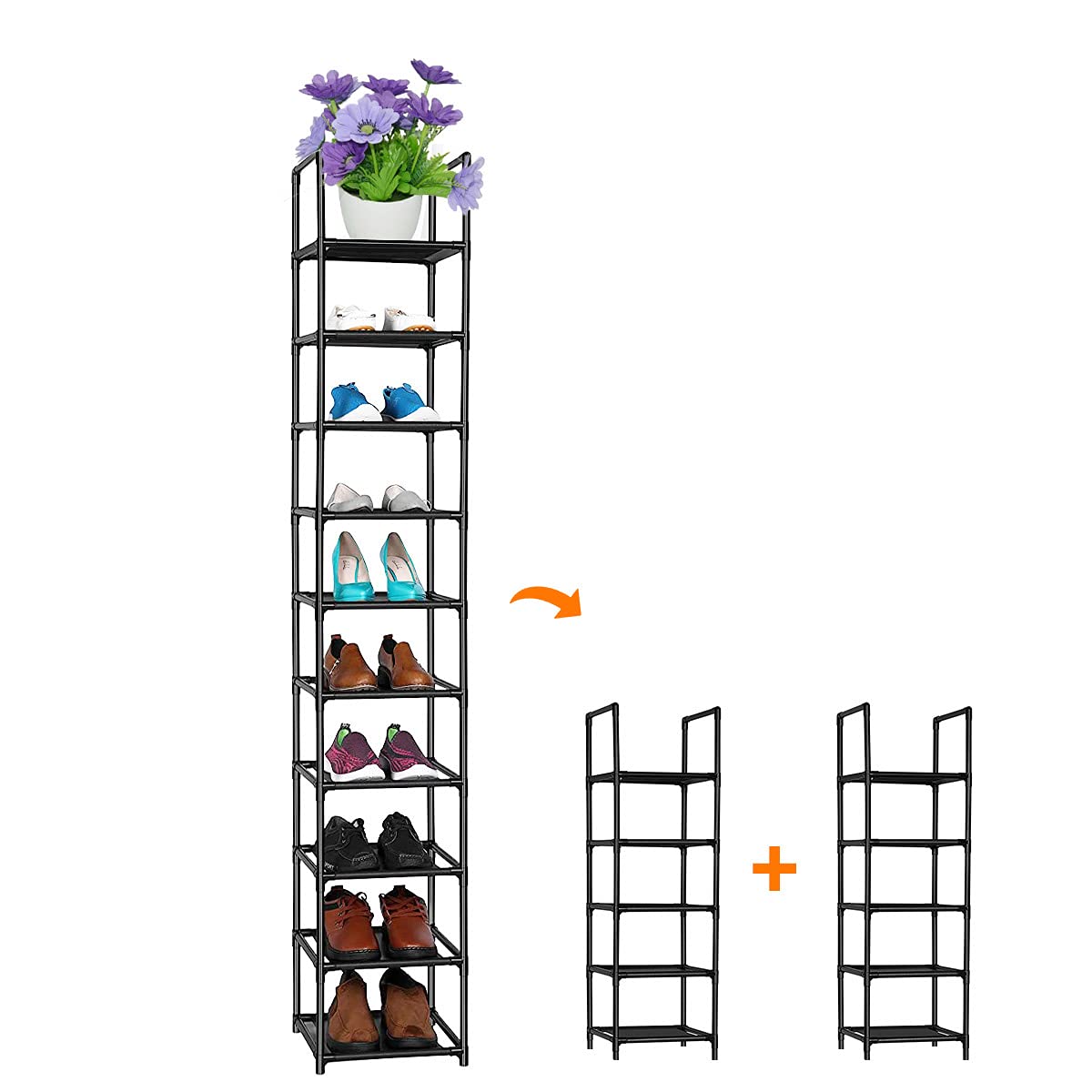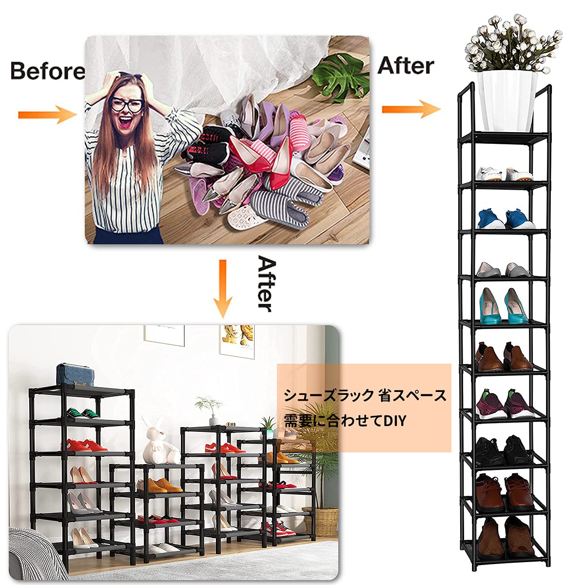 【棚数を自由に調節可能】Diy自由自在に組み立て、棚板を1枚取り付けなければ、靴を入れることができます。シューズラックの高さを自由に調整できるので、靴の数によって2個5層、10層までお好みによって自由に組み合わせることができます。お好みに応じて自由に組み立てられます。