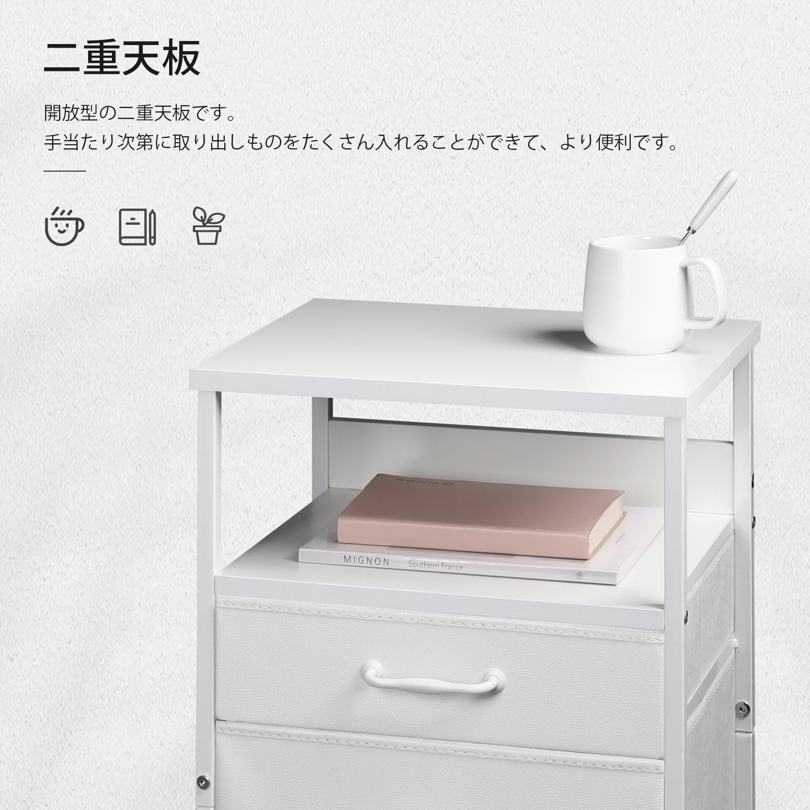 【注意】直射日光の当たる場所に収納棚を置くのは避けますとお勧めます。【収納力と美しさを兼ね備え】天板が二重になっているので、手に取るものが多くなり、収納スペースが増えました。引き出しが二つあるので、あまり使わない物や小物を入れることができます。ホコリを防ぐだけでなく、雑多に見えません。配色は様々なシーンに適しています。サイドテーブル、ソファーテーブル、オフィスキャビネットなどに使うことができます。