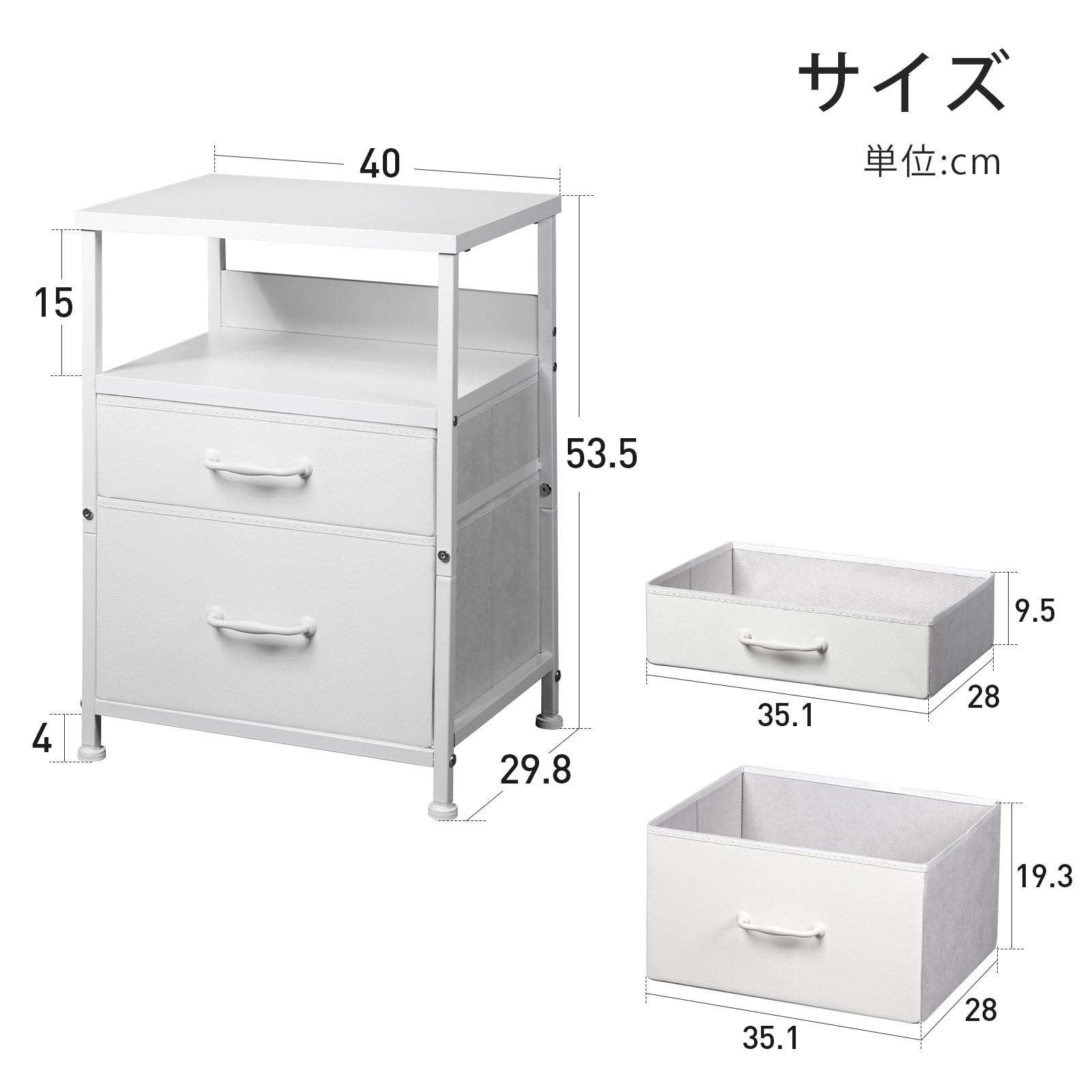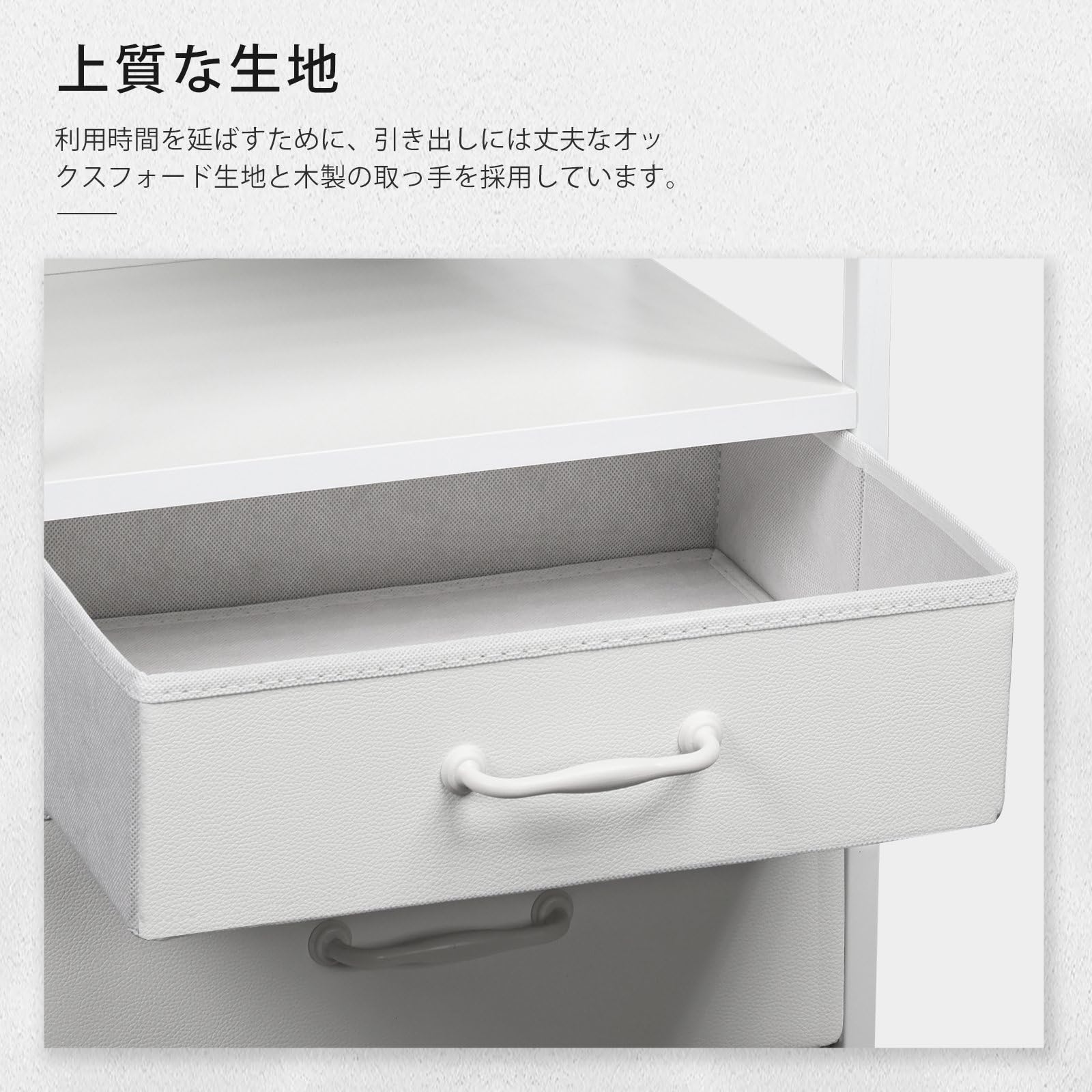 【サイズ】■ファブリックチェスト本体サイズ:幅40奥行29.8高さ53.5cm ;重さ:4.7kg ■天板材質:MDF(E1級合成樹脂強化板) 厚さ:15mm ;■引き出し生地:オクスフォードとMDF ;■取っ手材質:天然木 ■フレーム材質:15mmのスチール