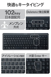 本格静音設計でありながら、軽い打ち心地を実現したワイヤレスタイプの静音薄型キーボードです。デスク周りスペースを有効に使えるコンパクトサイズで、数字入力に便利なテンキー付きです。