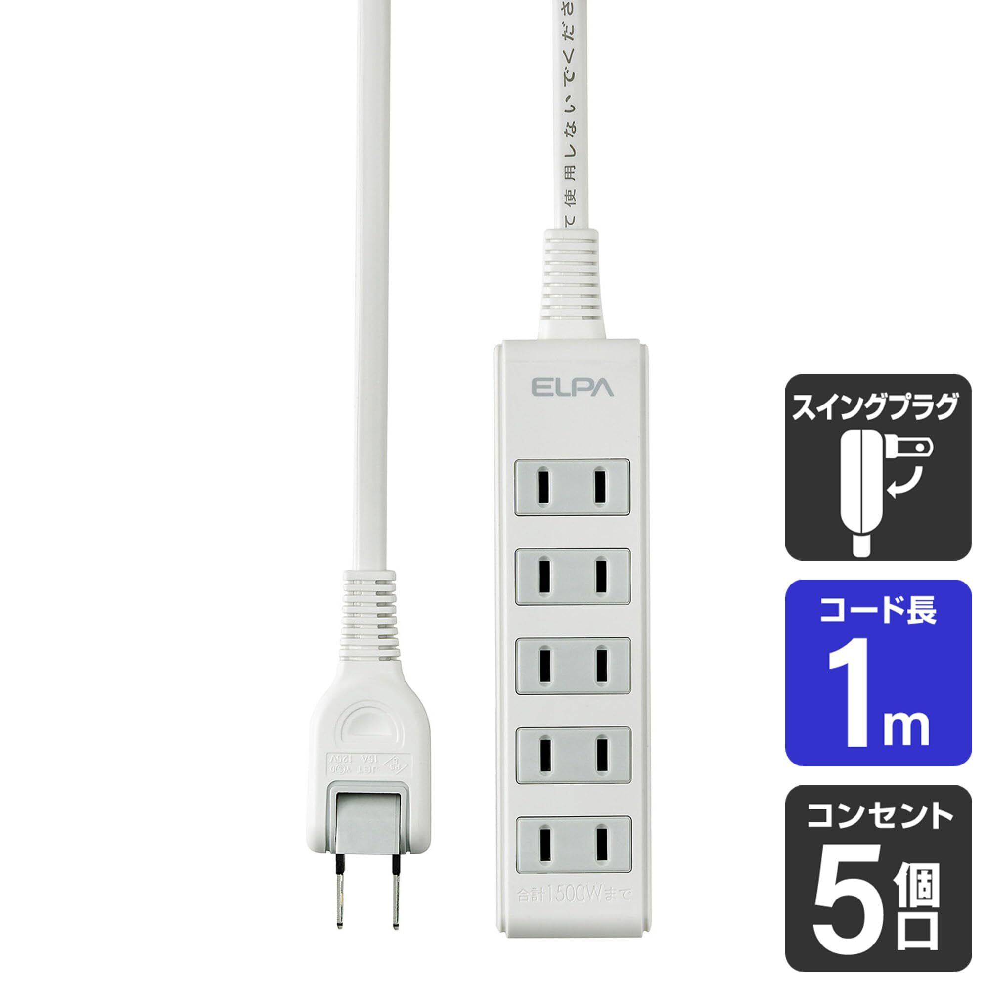 エルパ (ELPA) コンパクトタップ 電源タップ 延長コード 125V 5個口 1.0m ホワイト LPT-501N(W)