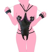 セクシーでカッコいい ボンテージ コスプレ ベビードール です。光沢のあるエナメル風PUレザーを使用しておりますので、高級感があり、アナタの魅力をより一層引き立ててくれます。付属のチェーンと手枷で両腕を拘束することができるので、ソフトな調教プレーも楽しめます。