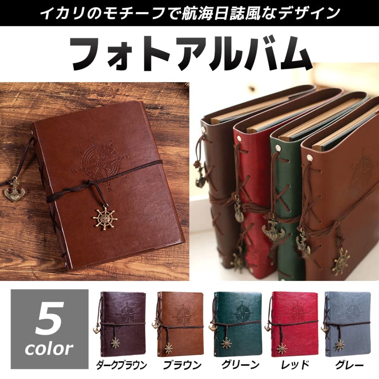 【カラー】ダークブラウン、ブラウン、グリーン、レッド、グレー【素材】合成皮革、ステンレス、紙【ページ数】60ページ(30枚)【サイズ】カバーサイズ:18×22㎝、ページサイズ:15×21㎝