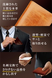 【とことん使い勝手を研究されたデザイン】制作にあたり、ビジネスマンへのアンケートを実施。全体的にコンパクトなデザインでありながら取り出しやすい使い勝手を重視し、横幅を当初の設計より5㎜広げて、革の折り目も1段にすることで取り出し時の引っ掛かりをなくした幅広設計。・革の厚みは薄すぎず、厚すぎない適度な厚みの薄型設計。・カードや頂いた名刺などを分けて入れるサブポケットが2つ。・大容量、約50枚収納できる十分な広がりある厚み。カラーも革本来の特徴がよく出る人気の6色を採用。柔らかく、手になじむ本格牛革素材を全面に使用。経年劣化(エージング効果)で使い込むほどに革本来の味が出て来ます。熟練の職人が一品一品細部まできめ細かく丁寧に手作業で仕上げております。