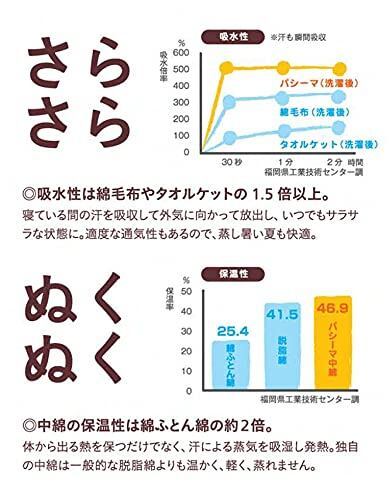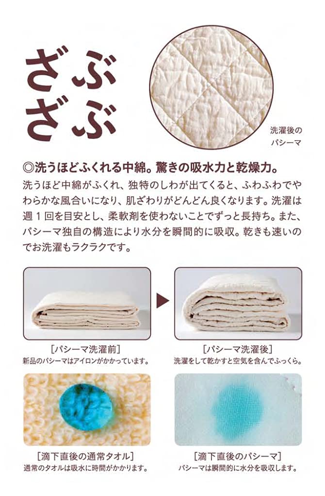 丸洗いできる清潔なパシーマは、吸湿性・吸水性・保温性に優れた夏でも冬でも年中使える寝具です。