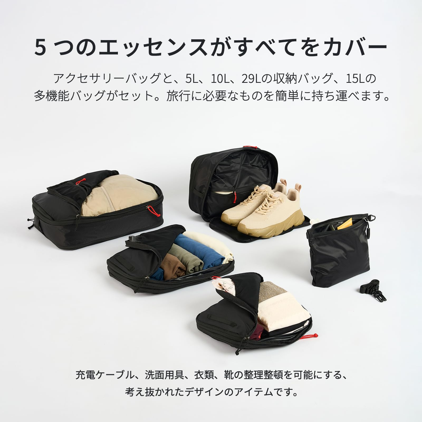 便利な5点セット:パッケージにはライトポーチ、5 L、10 L、29 L、多機能シューズキューブの5点が含まれており、充電ケーブル、洗面用具、衣類などを区別して納められ、様々な収納ニーズに満たすことができます。また、1つの内部メッシュポケット、1つの大きな防水インナーポケットも設計されており、使い勝てが良いです。更に、圧縮可能な仕様より、スーツケースなどスペースを取らずに入れられます