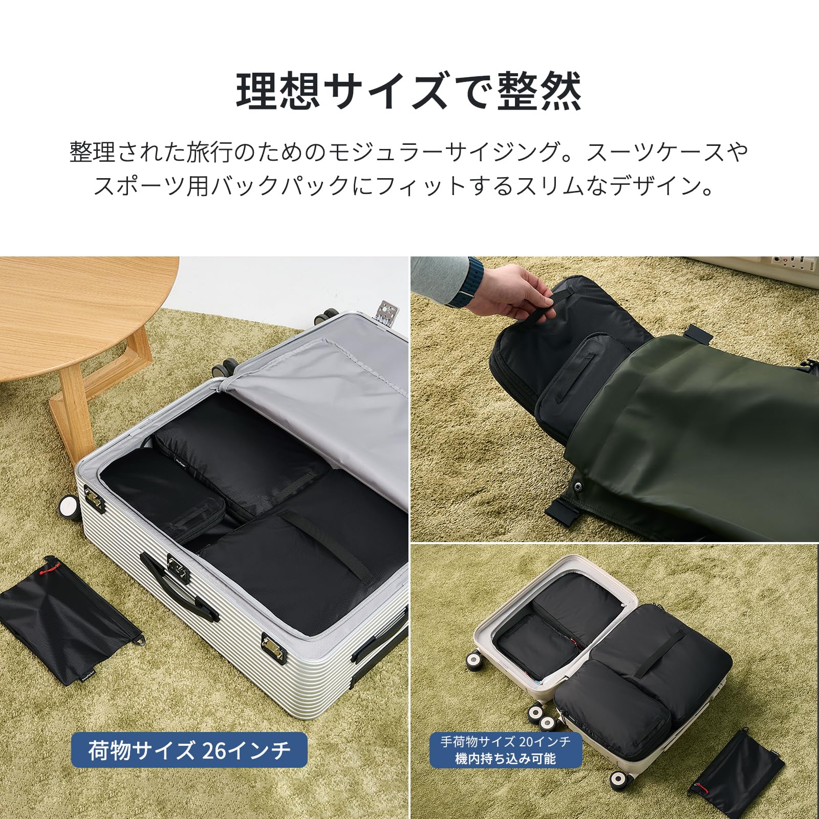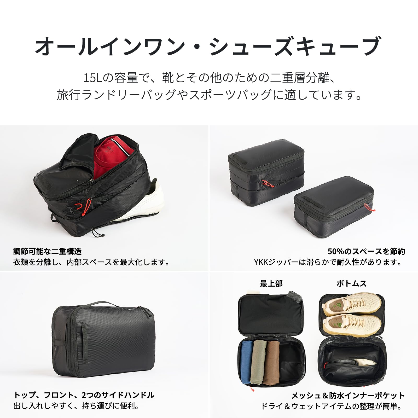 オールインワンシューズキューブ:靴収納専用のシューズキューブも2層構造で、靴とその他のアイテムを分けて納められ、荷物をすっきり且つ清潔に配置され、探し出しも容易になります。また、伸縮性のあるコンパートメントにより内部スペースを調節可能で、荷物の量に応じて柔軟に対応することができます