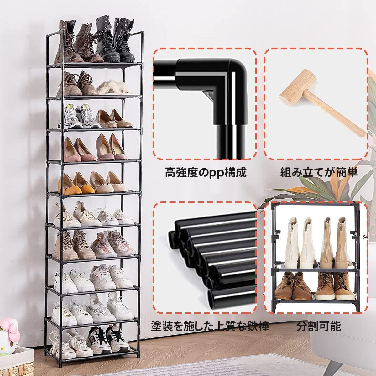 シューズラック 10段 靴収納 靴棚 18-20足 下駄箱 省スペース シューズボックス スリム 玄関に靴を効率収納 靴入れ 組み立て式 幅約45×奥行28×高さ176cm(ブラック 10段)