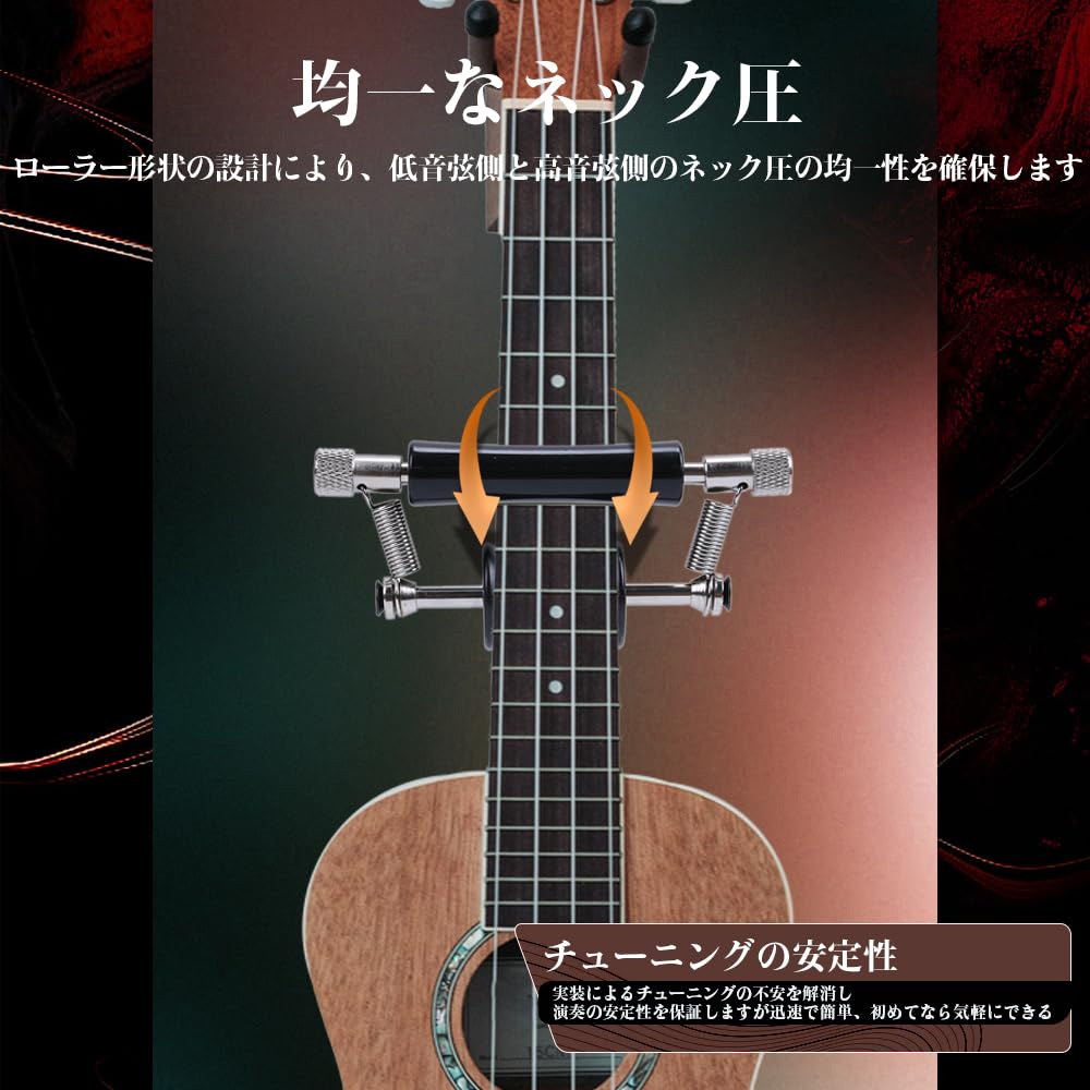 **4. 【等化圧力、安定同調】 ギターネックにぴったりとフィットするローラー形状を採用し、どこに取り付けても、低音弦側と高音弦側のネック圧の均一性を確保しています。これにより、実装によるチューニングへの不安が解消されるだけでなく、演奏の安定性も保証されます。