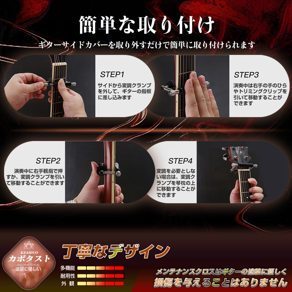 **6. 【注意事項、安心して使用する】 カポタストのシリコン部分は通常ギター塗装に悪影響を与えないが、ニトロセルロース、ラッカー塗装などの敏感な材質を使用する場合は、使用環境、圧力、取り付け時間に注意する必要がある。長時間の取り付けや不適切な使用は塗装の脱落などの不測の事態を招く可能性がある。そのため、必ず説明書に従って正しく使用し、メンテナンスしてください。