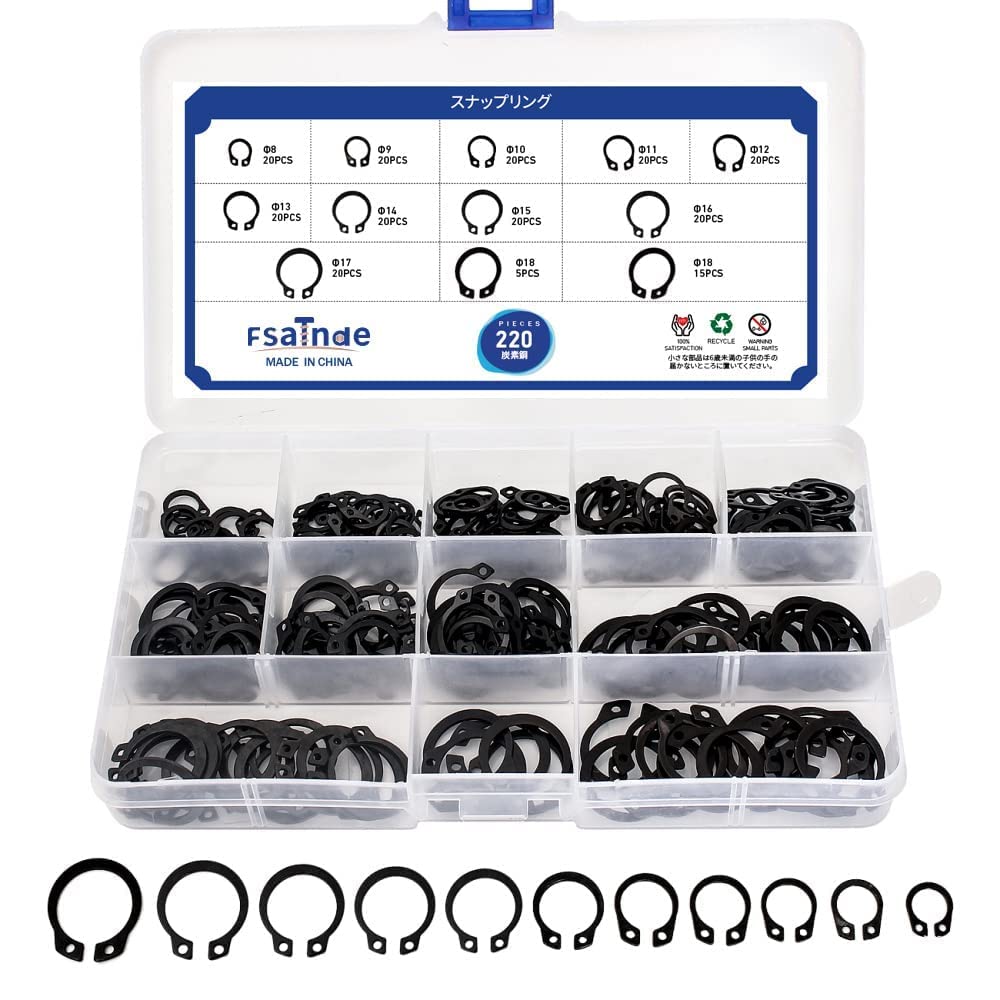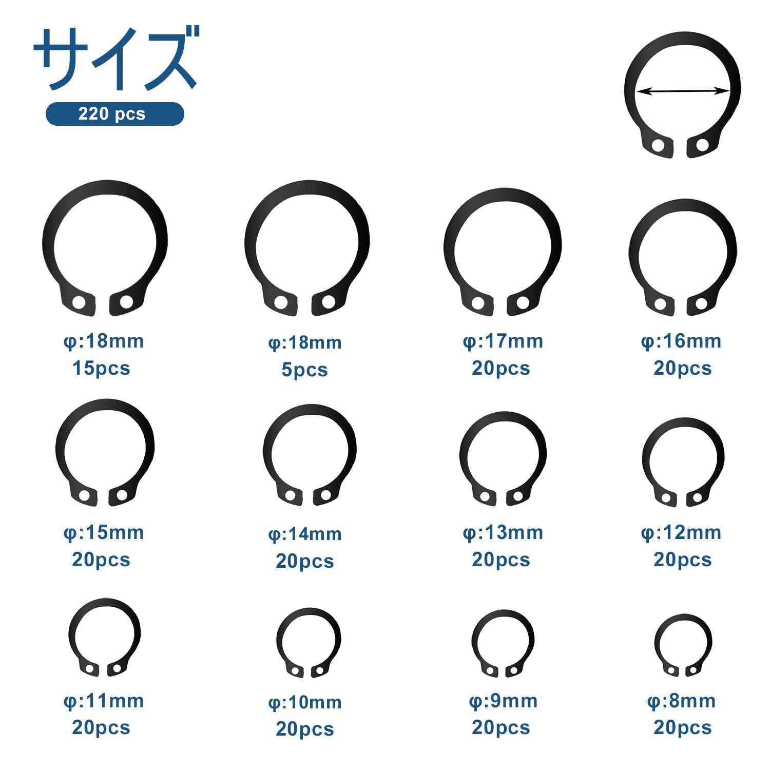 多様な必要を満たすために、11サイズのCクリップ、8mm、9mm、10mm、11mm、12mm、13mm、14mm、15mm、16mm、17mm、18mm合計220個が含まれています。
