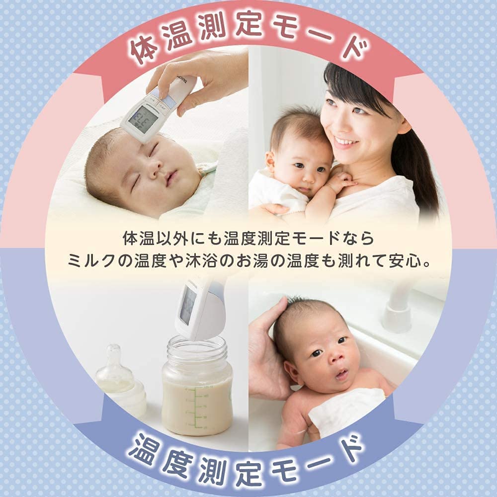洋服を着たまま、おでこで測定できる非接触体温計。寝ている子供や、動いてしまう赤ちゃんなどの体温もわずか1秒で測定できるので、測定時の負担が軽減できます。バックライト付きなので、暗い部屋でも電気をつけずに数値が確認できます。