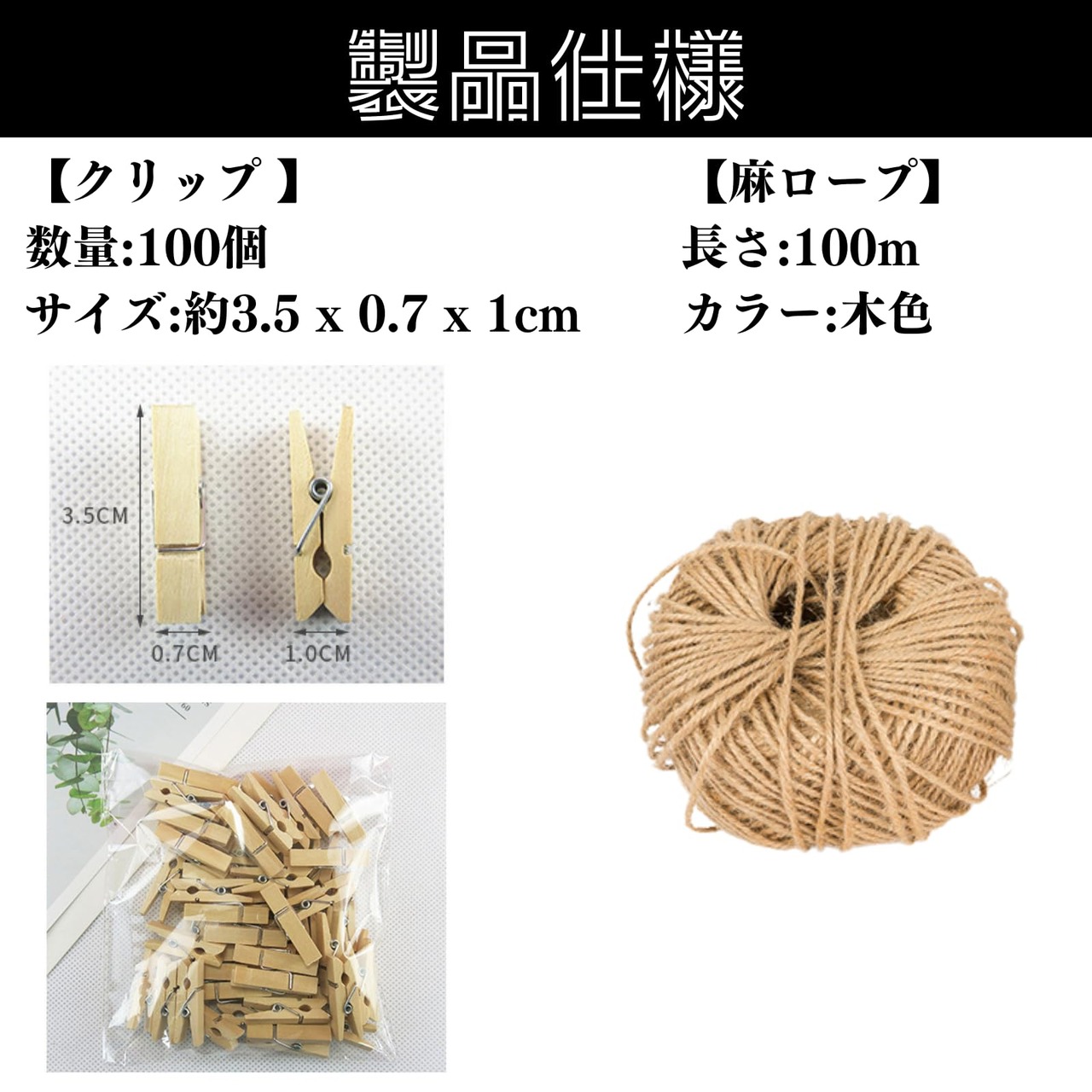 【クリップ 】数量:100個 サイズ:約3.5 x 0.7 x 1cm 【麻ロープ】長さ:100m カラー:木色
