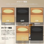 【常夜灯モード、記憶機能、タイマー機能搭載】低消費電力の常夜灯を備えており、お子様の一人寝や夜間の授乳、お年寄りの介護などに最適です。タイマー機能を利用すれば、自動で電源が切れるため、節電にもなり、消し忘れの心配もありません。また、記憶機能により、設定した明るさを保持するので、次回点灯時も同じ明るさで使用でき、いちいち調整する手間が省けます。さらに、ランプ交換の頻度が少ないのも便利なポイントです。