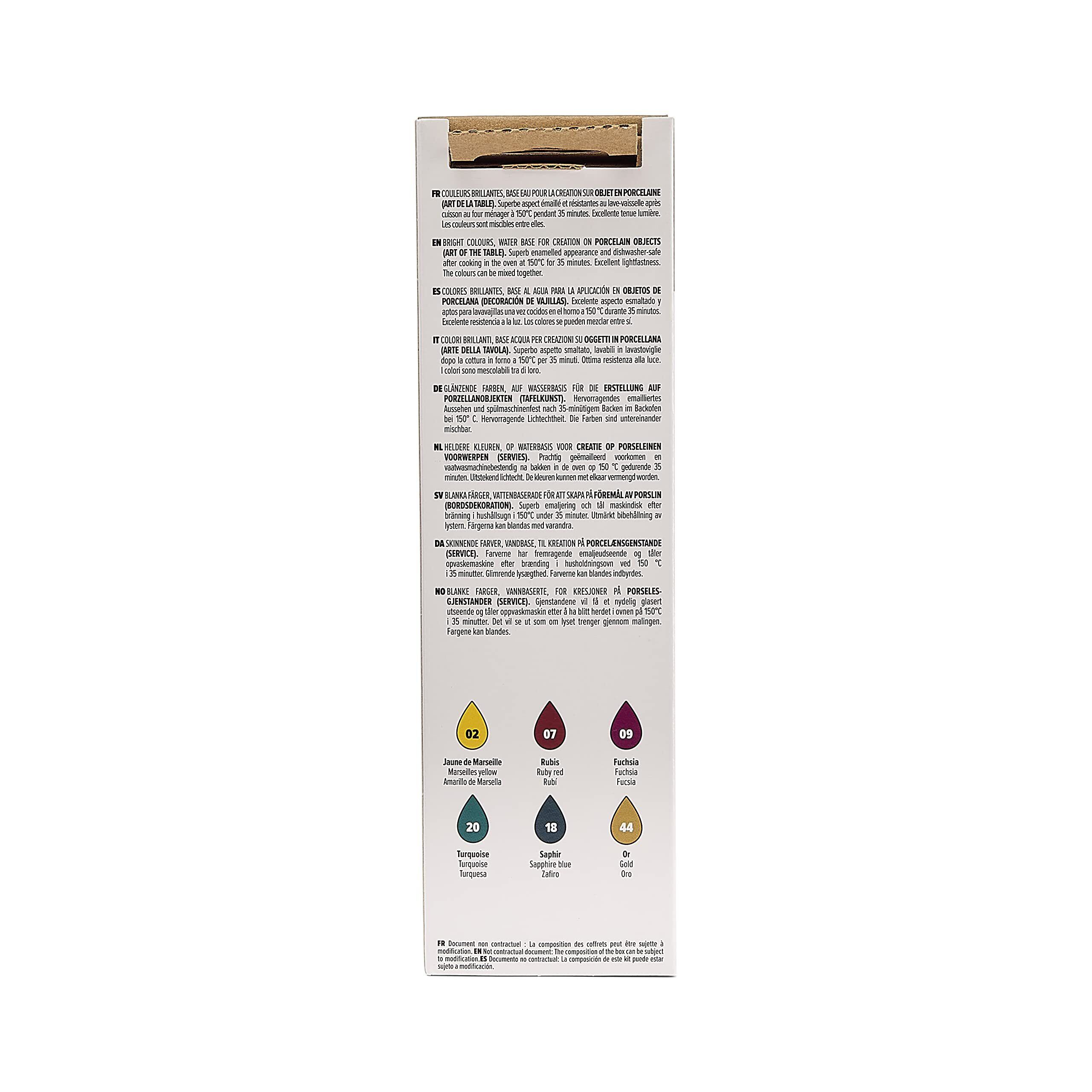 余熱をせずに常温の状態で作品をオーブンに入れ150℃の低温で35分間焼き付けることによって定着します。焼付け後の作品は水洗いしても色落ちしません。APマーク。取得の人体に無害で安全な水性絵具ですから作品は暮らしの中の器として安全にお使いいただけます。20mlボトル × 6色 セット内容:02マルセイユイエロー、07ルビーレッド、09フクシア、20ターコイズ、18サファイアブルー、44ゴールド陶磁器用家庭用オーブンで手軽に焼き付けできる陶器用水性アクリル絵具です。