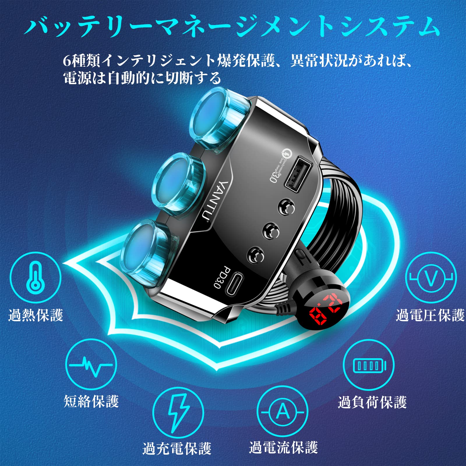 【最新PD22W&QC3.0高速充電規格搭載】各種設備の充電ニーズを満足するために、NEW登場した急速充電シガーソケットはTYPE-C(PD22W)とQC3.0急速充電規格を同時に追加し、スマホに充電だけでなく、最新のiphoneやパソコンも給電できます。また智能充電と智能分流機能を搭載し、超高速充電を実現しました。