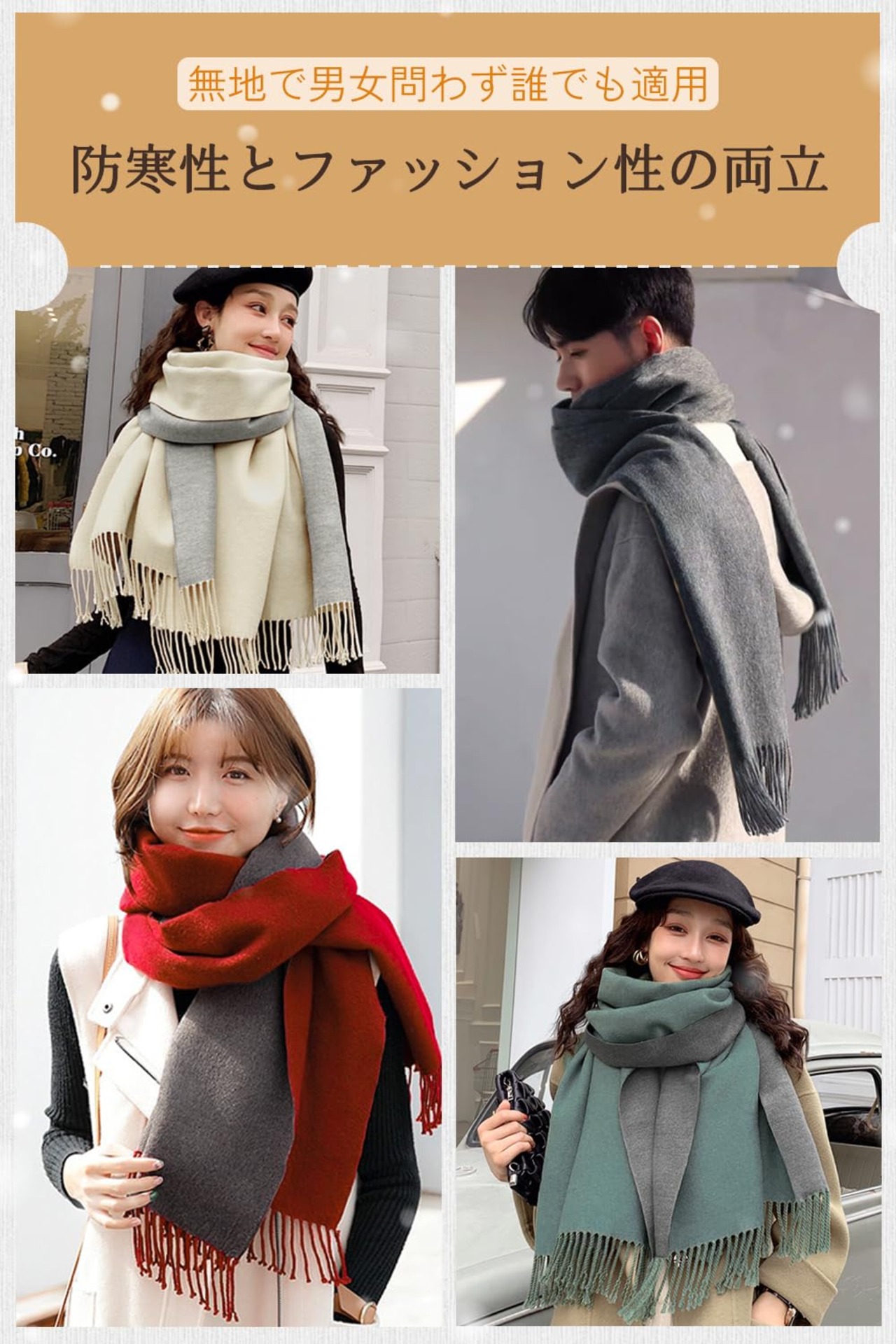 【両面使える 男女問わず誰でも適用】一枚に2色あり、正反側区別なく両面とも使えるマフラーです。シンプルなデザインに、エッジに施されたフリンジがポイントになり、静動完璧な組み合わせです。カジュアルからフォーマルまで幅広く対応できマフラーなので、男女問わず誰でも相応しい万能アイテムです。