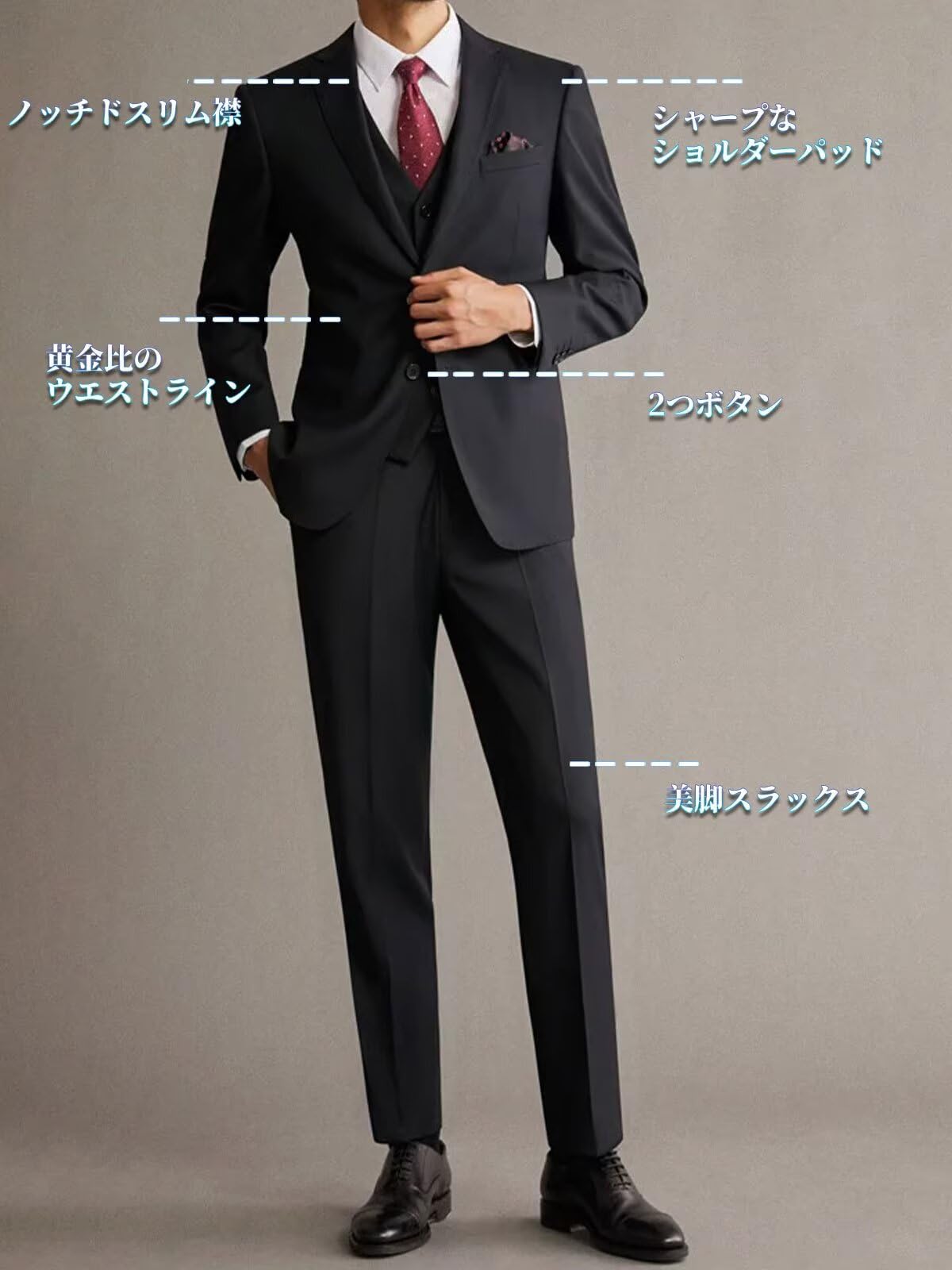 【デザイン&仕様ポイント】スリムスーツにぴったりのナローラペル、流行の2ボタンダザイン、両サイドにフラップポケット(胸ポケットは飾り)を備えています。後ろ姿も美しいセンターベント、スッキリとした印象を与える折り目付きノータックパンツが特徴です。