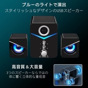 【デザイン】軽量コンパクトに設計されたセパレートタイプのスピーカーです。デスク上でもスペースをあまり気にすることなく左右に設置することが可能です。電源を入れるとブルーのLEDライトが点灯しオシャレに演出します。