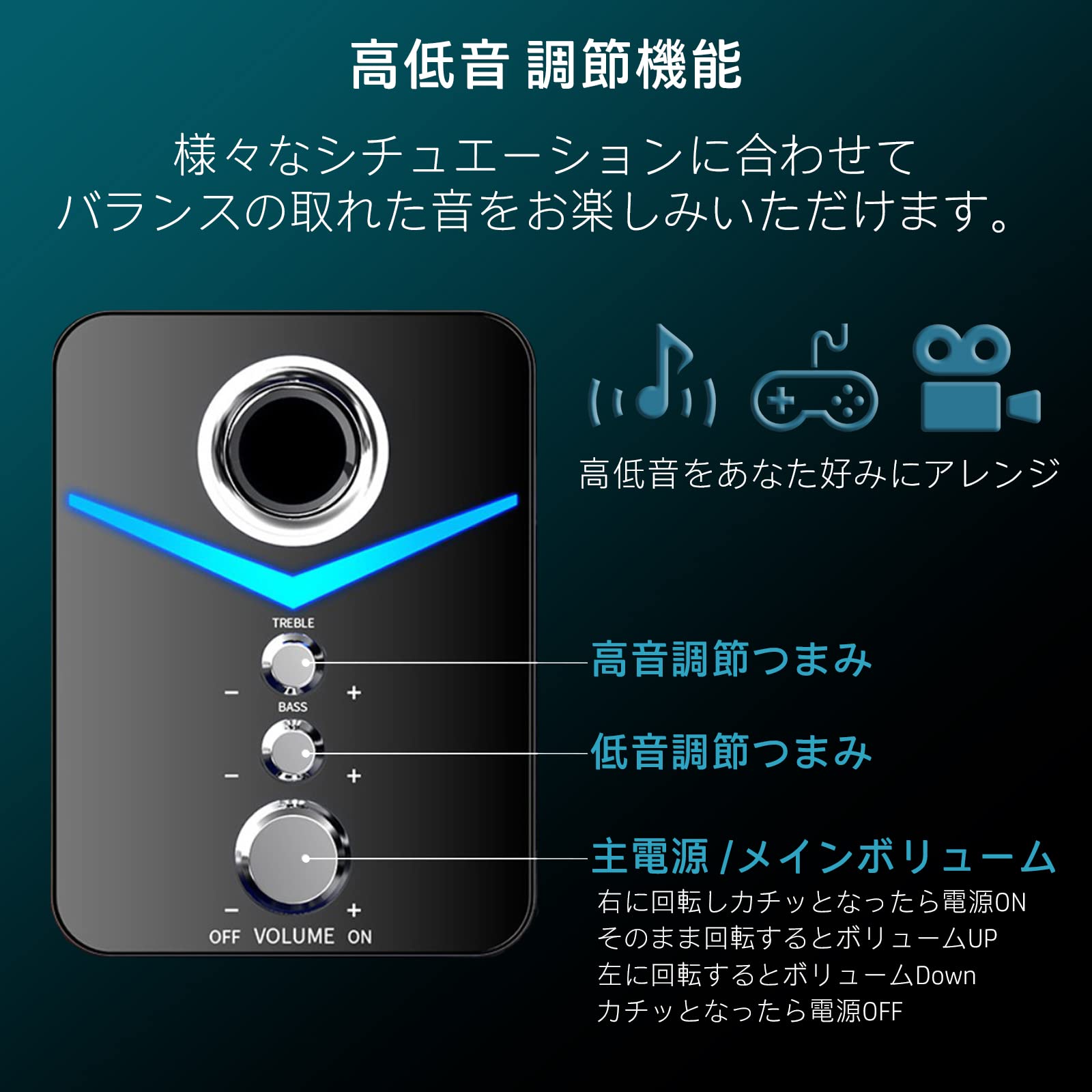 【高音と低音調整】メインスピーカーにはボリューム調整だけではなく、高低音の調節機能がついているのでお好みのバランスに調整することが可能です。お手頃ながらパワフルな重低音をお楽しみいただけます。