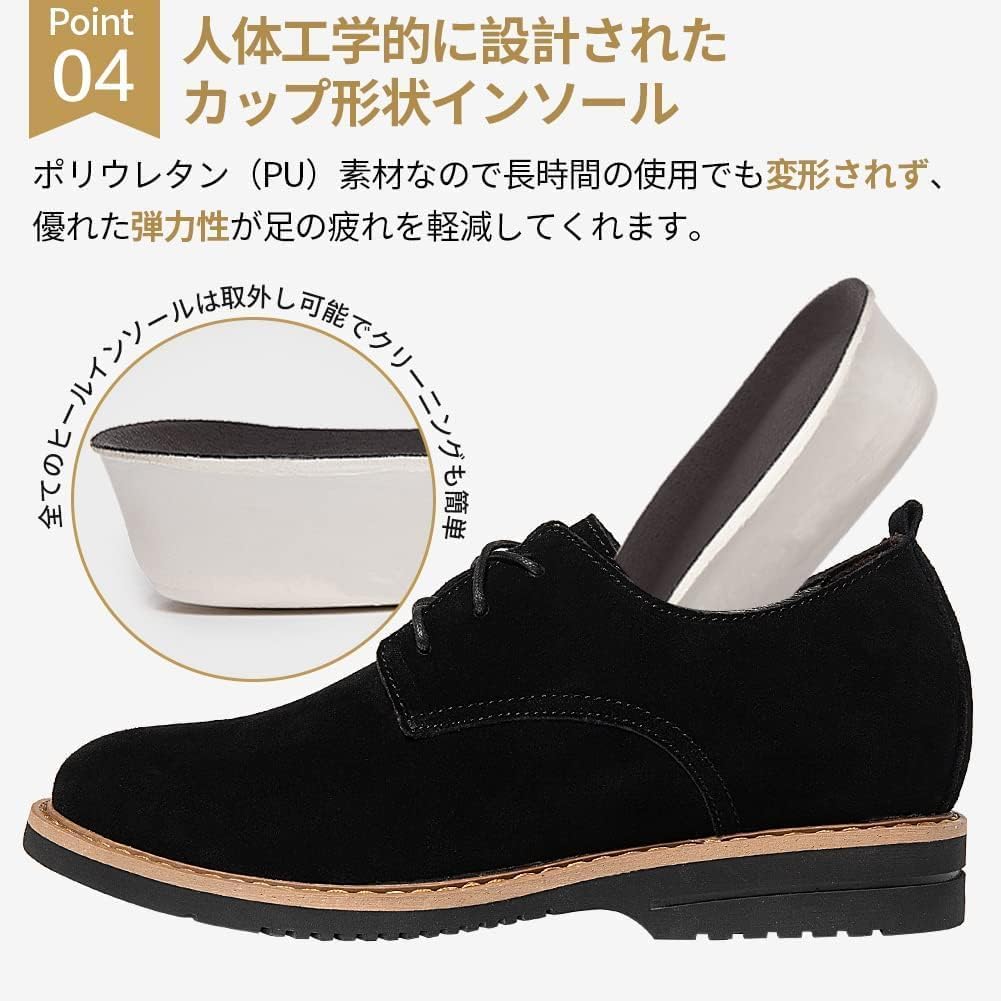インソール3cm+ヒール高3cmの合わせて6cmアップでき、横から見てもわかりづらい絶妙なバランスで構築されています。インソールに厚みをもたせた設計のシークレットシューズは、厚底やヒールが高い靴と同じような身長アップ効果が狙えます。インヒール構造によりシークレットシューズだとわかりにくい仕様。グリップ力とクッション性を兼ね備えたアウトソールを採用しているのもポイントです。上質なベロアやキップレザーを活かしたシンプルなデザインで、カジュアルにもきれいめにも活用できます。6-8cmスタイルアップでき、自然に背を高く見せたい方におすすめです。シンプルで使い勝手のよいデザインのため、ビジネスシューズですがモードファッションに合わせて普段使いもできます。