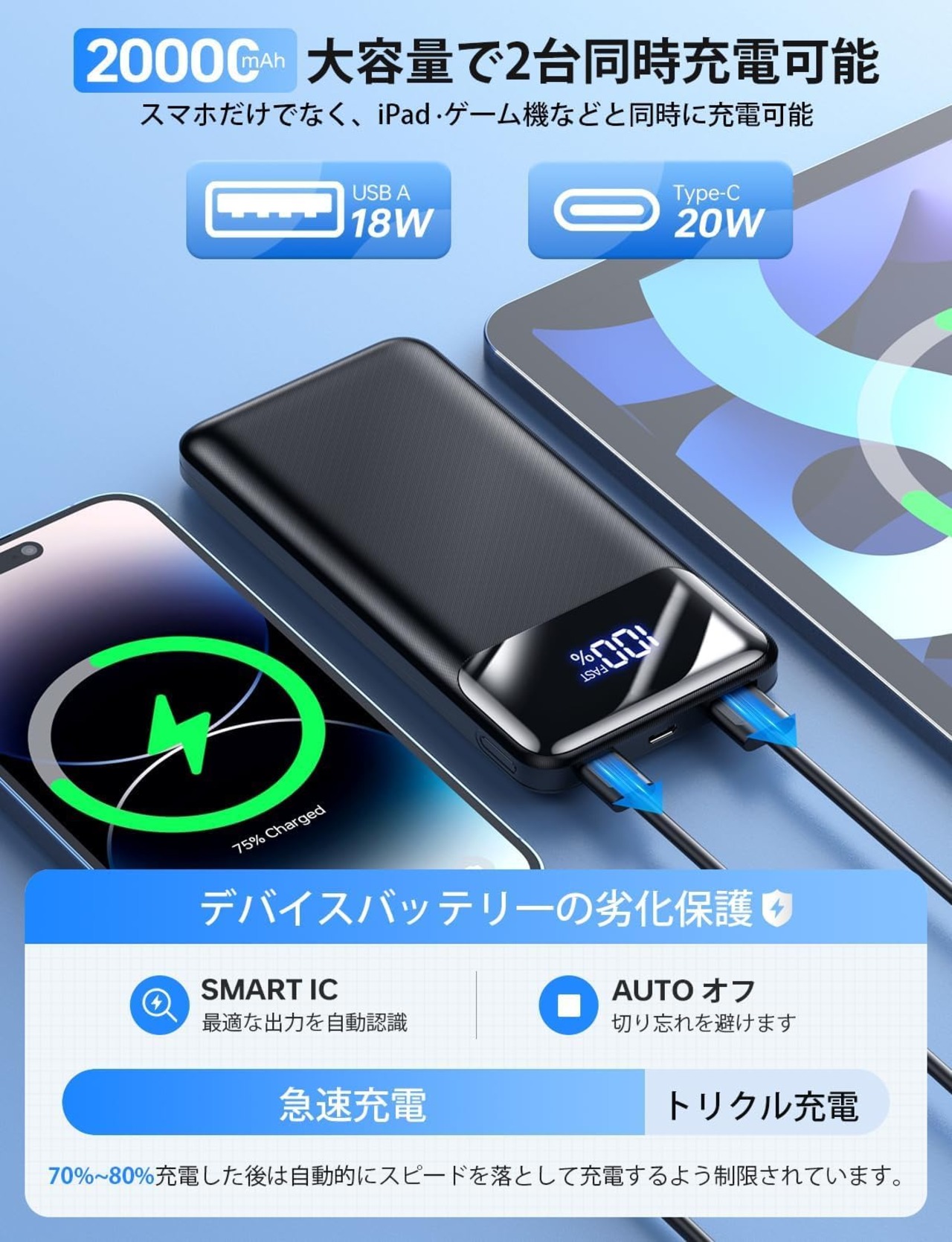 ✈【高い互換性&飛行機内に持ち込み可能】USB-Aポート、USB Type-C(USB-C)ポートをそれぞれ1ポートずつを搭載することで、スマートフォン、タブレット端末、ノートPC等、ほぼすべての機器に対応。低電流モードも搭載されており、Bluetoothヘッドセット、イヤホン等の小型電子機器やウェアラブル機器にも最適な電流で充電することができますので、かなり便利です。また本製品はiPhone、iPadシリーズの急速充電に対応しているため、非対応製品に比べて速く充電できます。航空機内へ持ち込み可能なバッテリー容量により、国内外の飛行機旅行に使え、待ち時間や移動中にも充電することができます。(※航空会社によって容量制限や規定が違う場合がありますので、事前に航空会社のHPでご確認ください。)【パッケージ内容】20000mAh モバイルバッテリー*1、USBケーブル*1、日本語取扱説明書*1