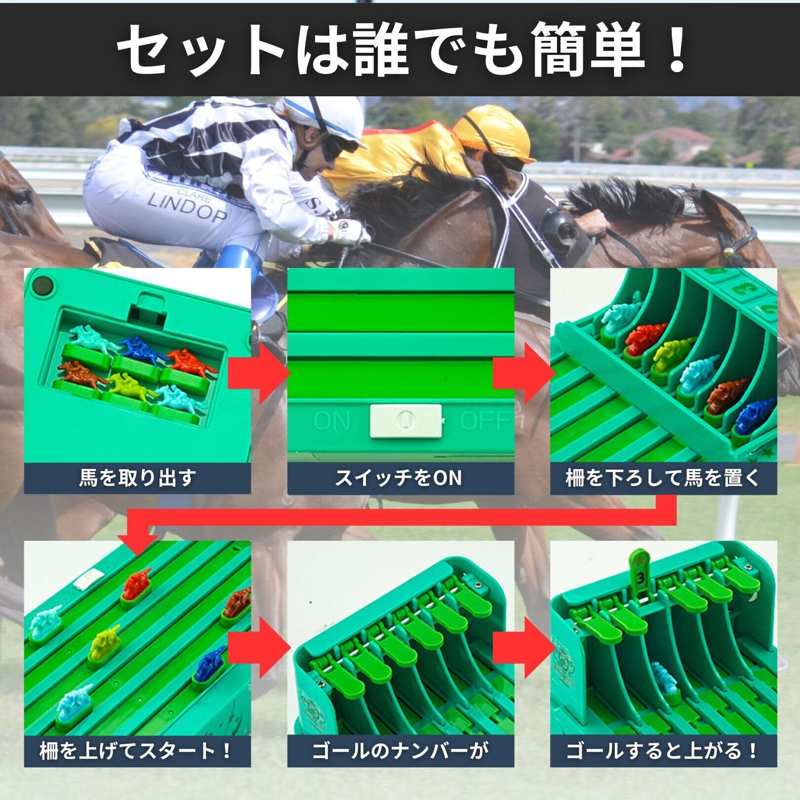 利便性を重視した設計で、簡単に保管や持ち運びができる競馬ゲーム。屋内外どこでも楽しめるので、どこにいても競馬の興奮を味わえます。家族や友人と盛り上がる楽しいひとときを提供します。