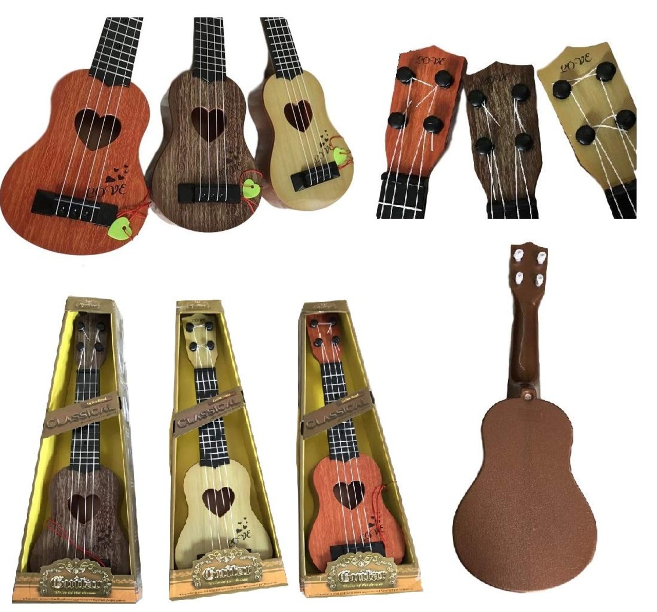 ウクレレ本体はプラスチック製で軽くて壊れにくく、持ち運びも楽々です。 木目調でホールがハート形になっているキュートなデザイン。撮影やインテリアの小物としてもおすすめです。