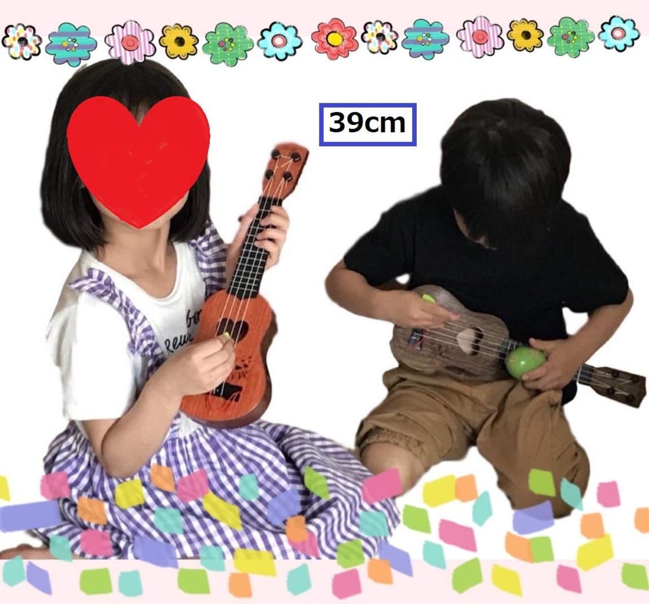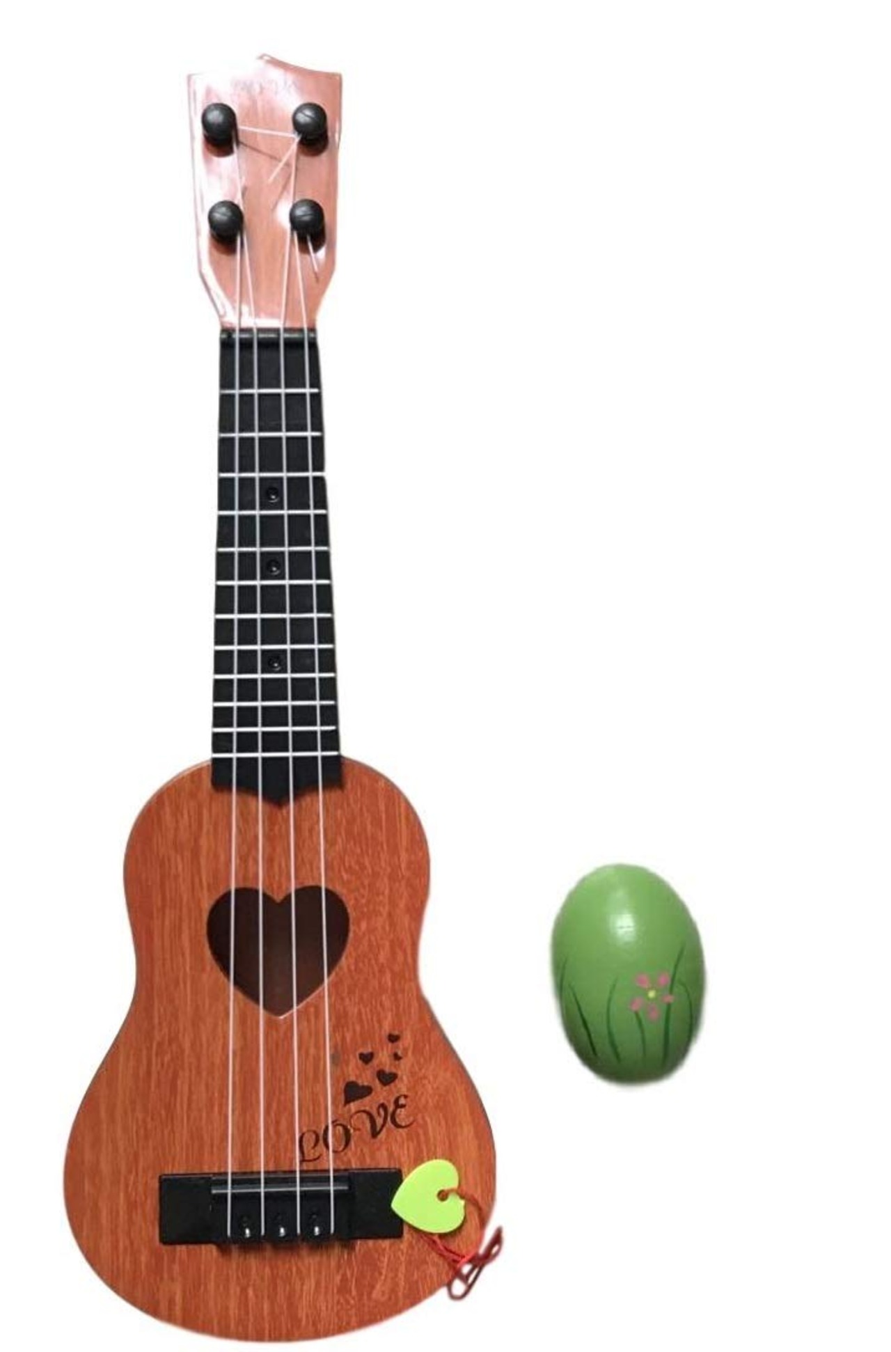 本体にハートのピックが付いているので指先や爪を傷めることなく、誰でも音を鳴らすことができます。 ペグ付きでチューニングも可能ですが、あくまで玩具ですので本格的な楽器とは異なりますのでご了承ください。