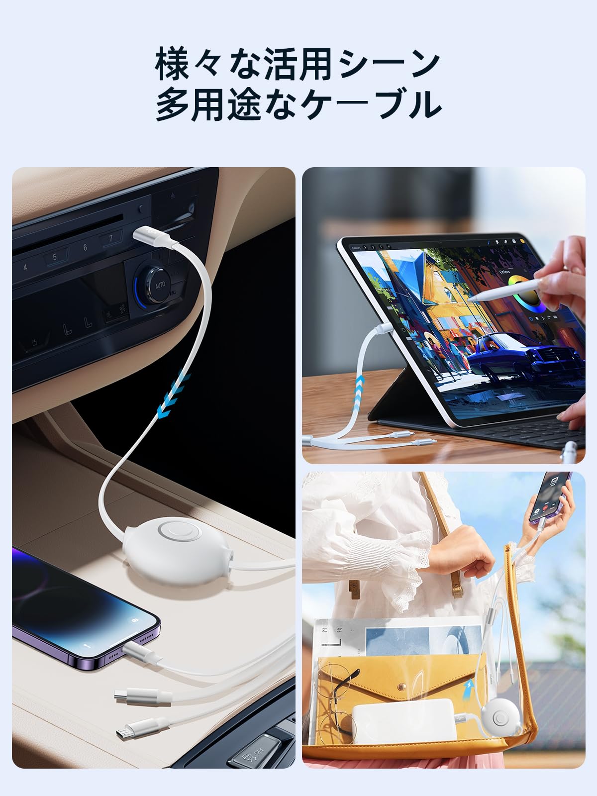 【▶18ヶ月間メーカー保証】パッケージには、1.2mの3in1 巻取り充電ケーブルが2個あります。お買い上げ日より、18ヶ月間に何か仕様上の不具合が生じた場合、お気軽にお問い合わせください。▲ご注意:三つの端子が同時に利用される時、電流が弱くなり、充電速度も遅くなる可能性があります。予めご了承ください。