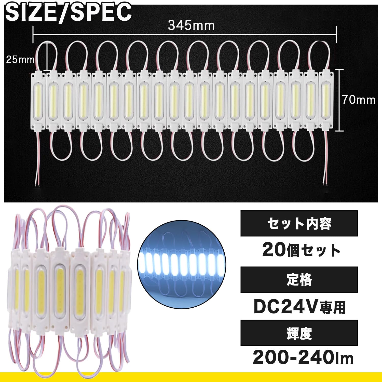 【商品内容】連結ランプ 20個×1/カラーバリエーション:ホワイト、レッド/電圧:DC24V/防水等級:IP65※車外へ取り付けが可/消費電力::2.4W/パネルサイズ:約70×19×3mm/パネル間の配線長さ 80mm