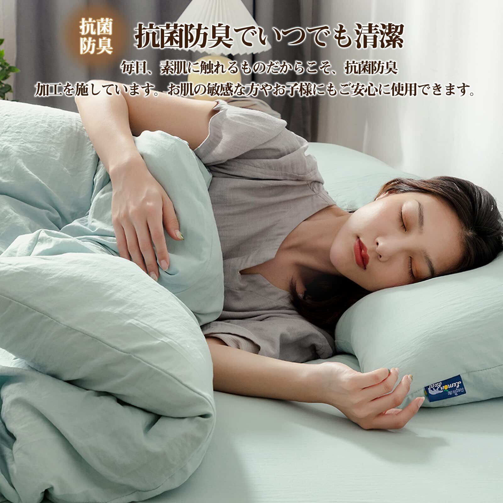 【通気性抜群&オールシーズン使える】水洗い加工で普通のベッドシーツと比べ、優れた吸湿性と通気性で、汗でもベタつかないサラサラ感を保ちます。ムレにくく、春夏秋はサラサラ、冬は暖かくて1年中快適にお休みいただけます。 丁寧に織り上げることにより、耐久性にも優れたしっかりとした生地に仕上がりました。