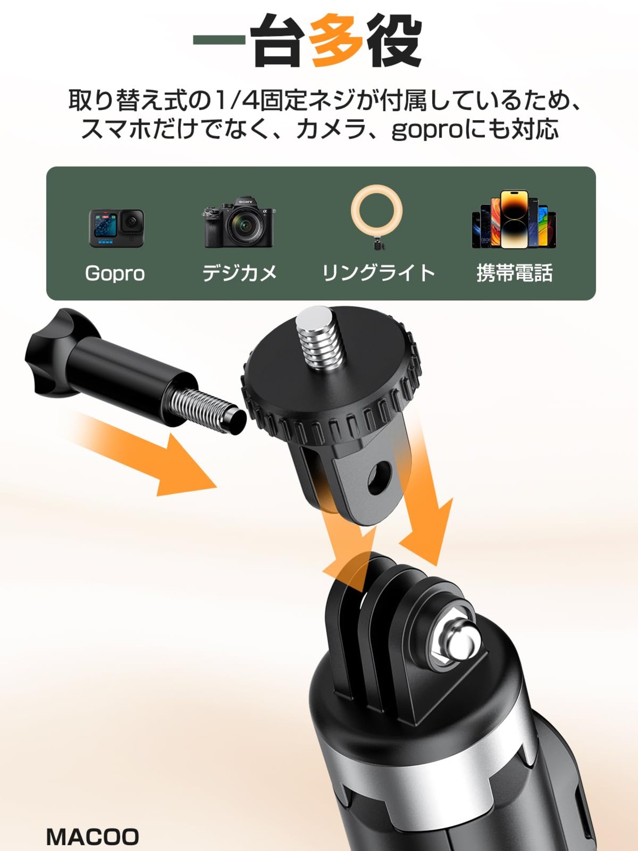 【安定性を新たな次元へ】長年にわたり、MACOOは新設計と安定性を一体にした自撮り棒を追求し続けます。業界初「四脚安定モデル」自撮り棒がついに新登場へ!従来の三脚式じどり棒と異なる、安定感が高い「四つ脚」と「加強レバー」を施すことにより、ダブル安定構造で耐荷重が高かったのは20kg、iphone proシリーズや重いカメラなどに接続してもOK!更に底部はシリコンバンドが付き、滑りやすい環境でも、風が吹いていても、不安定な岩場でも安定した撮影ができます。