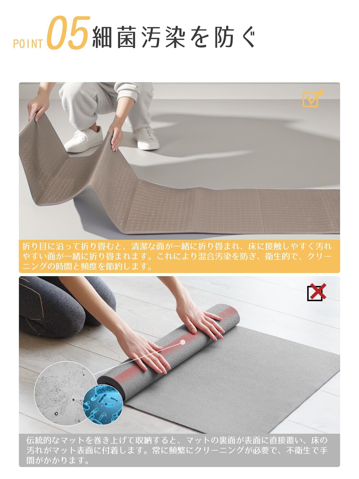 【細菌汚染を防ぐ】細菌汚染を防ぎ、従来の丸めたヨガマットよりも頻繁に掃除する手間が省けます。