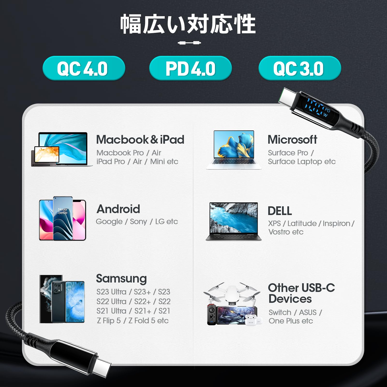 特徴 100W/5A 、PD対応、LEDディスプレイ、480Mbps高速データ転送、幅広い対応性、ナイロン編み、安全重視のこだわり設計、耐久性と柔軟性を両立