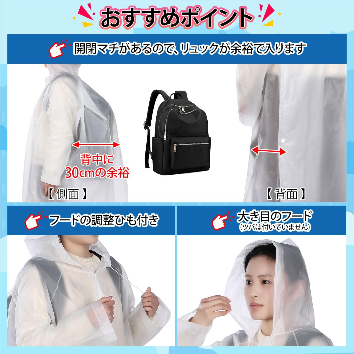 【30cmゆったりマチ×背中スナップで“リュック丸ごと”防水】 背面スナップを開くだけで最大30cmマチが拡張-大きめリュックを背負ったままでもサッと着て荷物を濡らさないレインコートです。自転車・バイク通勤、保育園送迎もスムーズに使えます。