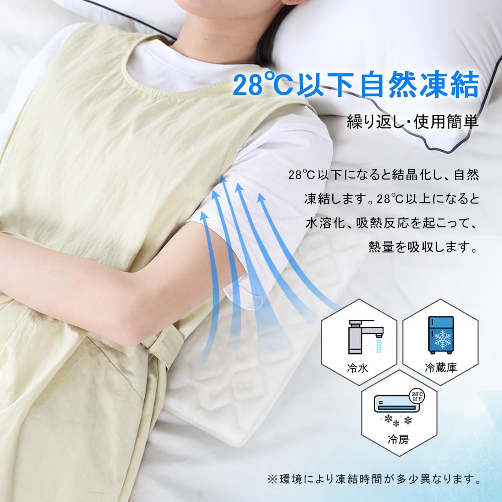 【結露なし、安心に使用】本商品は次世代のPCM素材をさいようしており、従来のジェルマットや氷枕と違い、結露が発生しなくて、寝具や衣類を濡らすことを心配する必要がありません。ご安心に使用いただけます。冷蔵庫に40分間置くと、完全凍結し、冷たさは60〜120分持続することができます。冷蔵庫で冷やすとさらに長時間楽しめます。