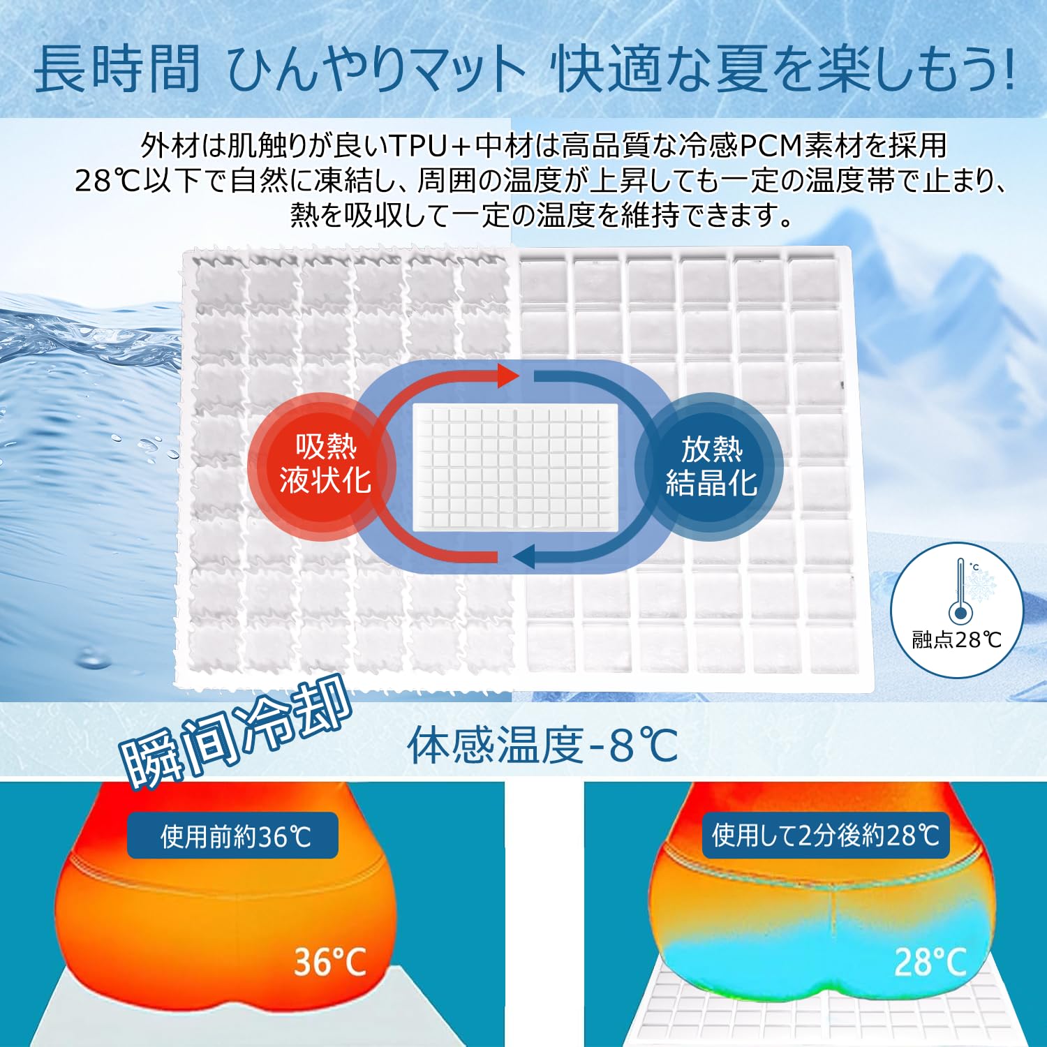 【軽量・結露しない】冷感シートは革新的な冷感素材を使用しており、水より凍結スピードが早く、結露の心配なく、敷いた場所や触れている肌や寝具や衣類が濡れることがありません!持ち運び時にカバンの中が濡れることもなし!