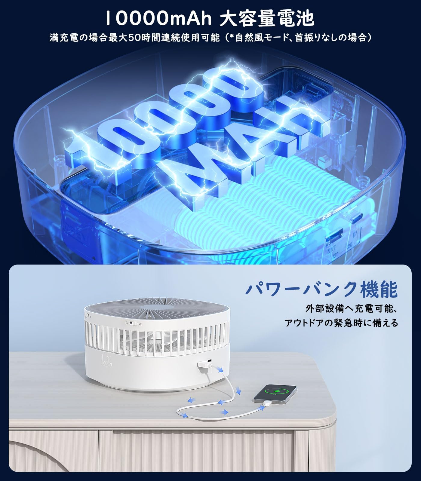 「10000mAh大容量電池・パワーバンク機能搭載」 扇風機に10000mAhの電池が内蔵され、満充電時間は約8時間かかり、一度満充電して9時間以上、最大50時間連続使用可能です。USB充電式で、コードレス使用でき、使用場所に制限がなく、在宅の使用はもちろん、アウトドアの使用も可能です。ベースには給電用と充電用の2つのポートがあり、TYPE-Cポートは付属のケーブルに繋いて扇風機の充電をします。USBポートは外部設備へ給電用のポートになり、スマホ、タブレット又は他の電気設備の電源として使えます。ピクニック、キャンプなどのアウトドアの場合、緊急事態に備えて、パワーバンク機能があれば大変助かります。